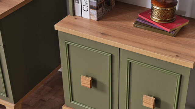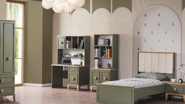 Yeşilin huzur veren tonları, ahşabın doğal sıcaklığıyla buluşuyor. Sade çizgilerile tasarlanmış bu oda, minimalizmin dingin estetiğini yansıtıyor.