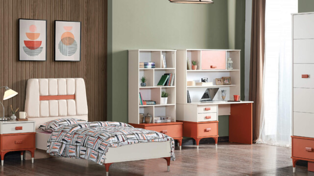 Turuncunun sıcak enerjisi, gençlerin özgün karakterini yansıtırken; krem detaylar, sade ve ferah bir atmosfer yaratır.